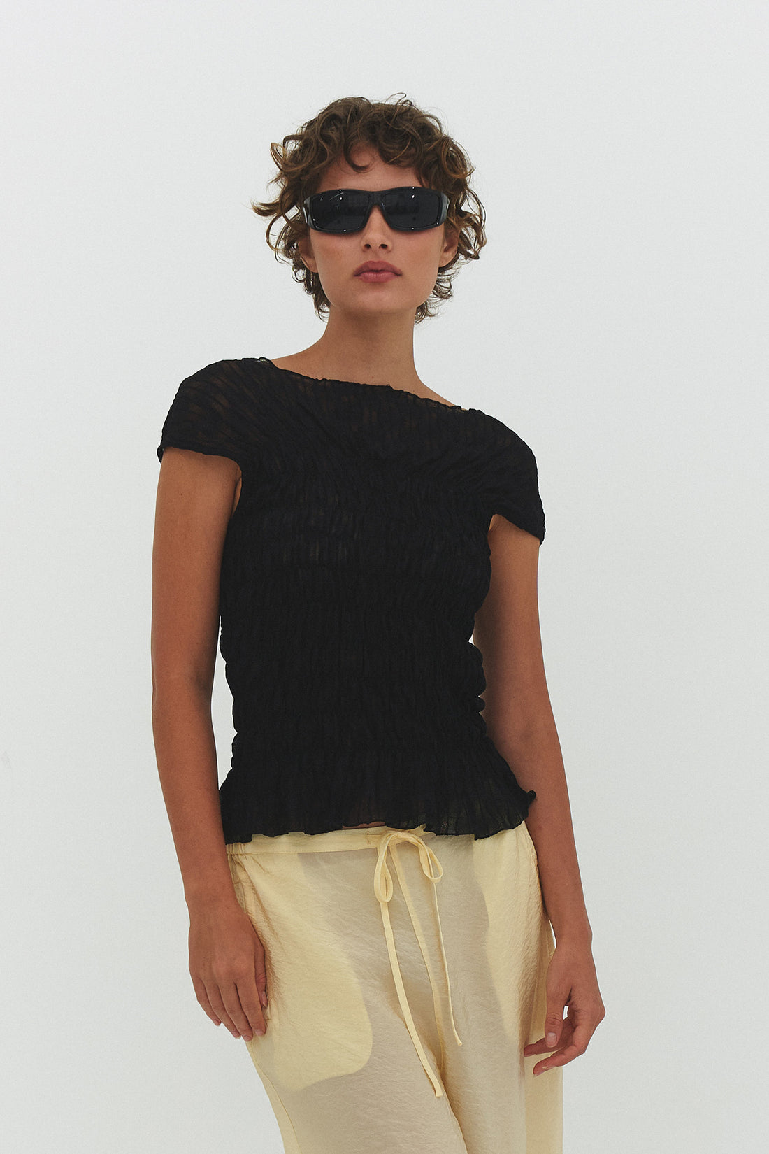 The Boat Neck Short Sleeve Top in Black is made from a smooth, stretchy ribbed...