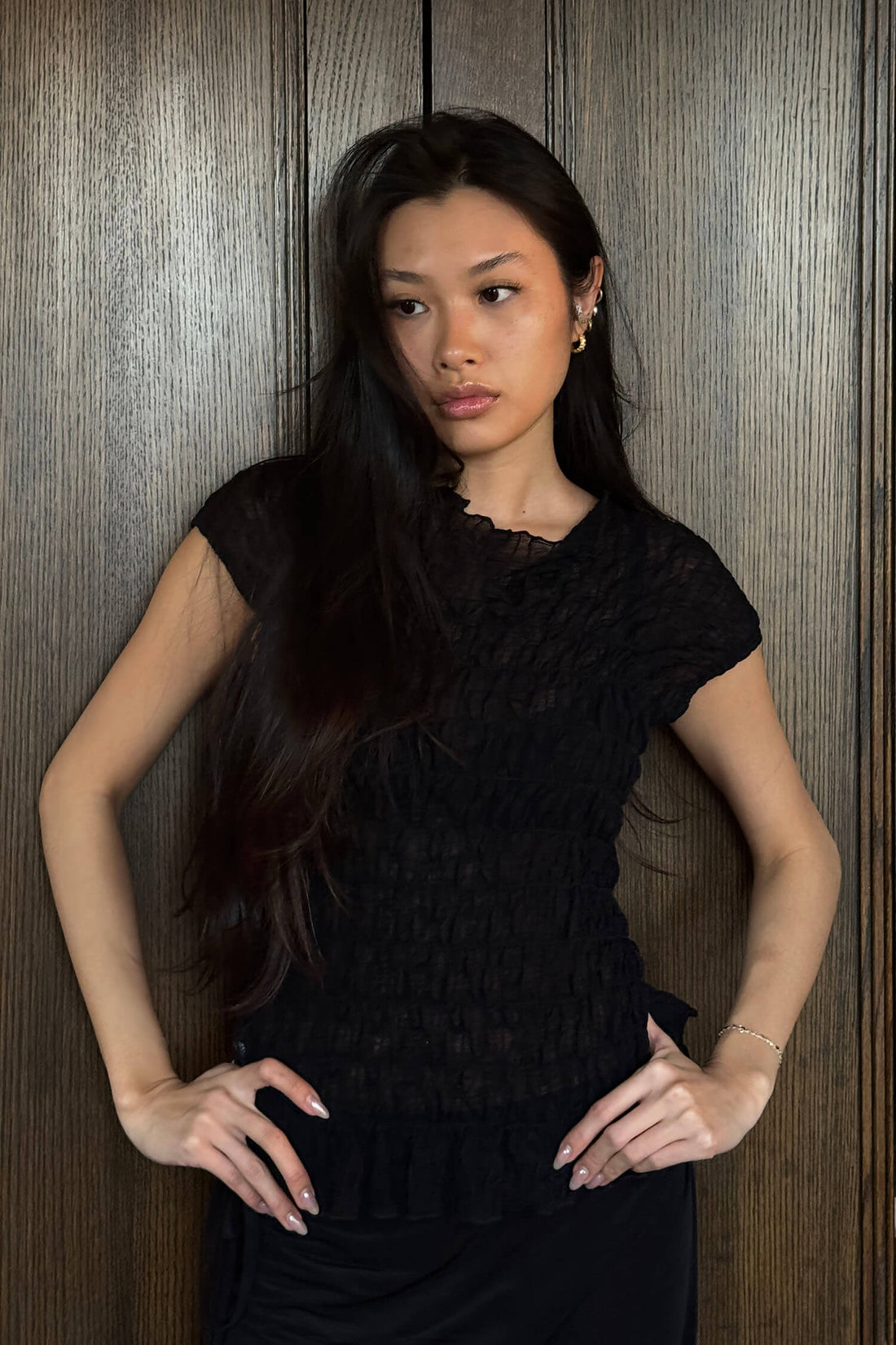 The Ross Off-Shoulder Ruched Top in Black is made from medium-lightweight stretch lace with softness...
