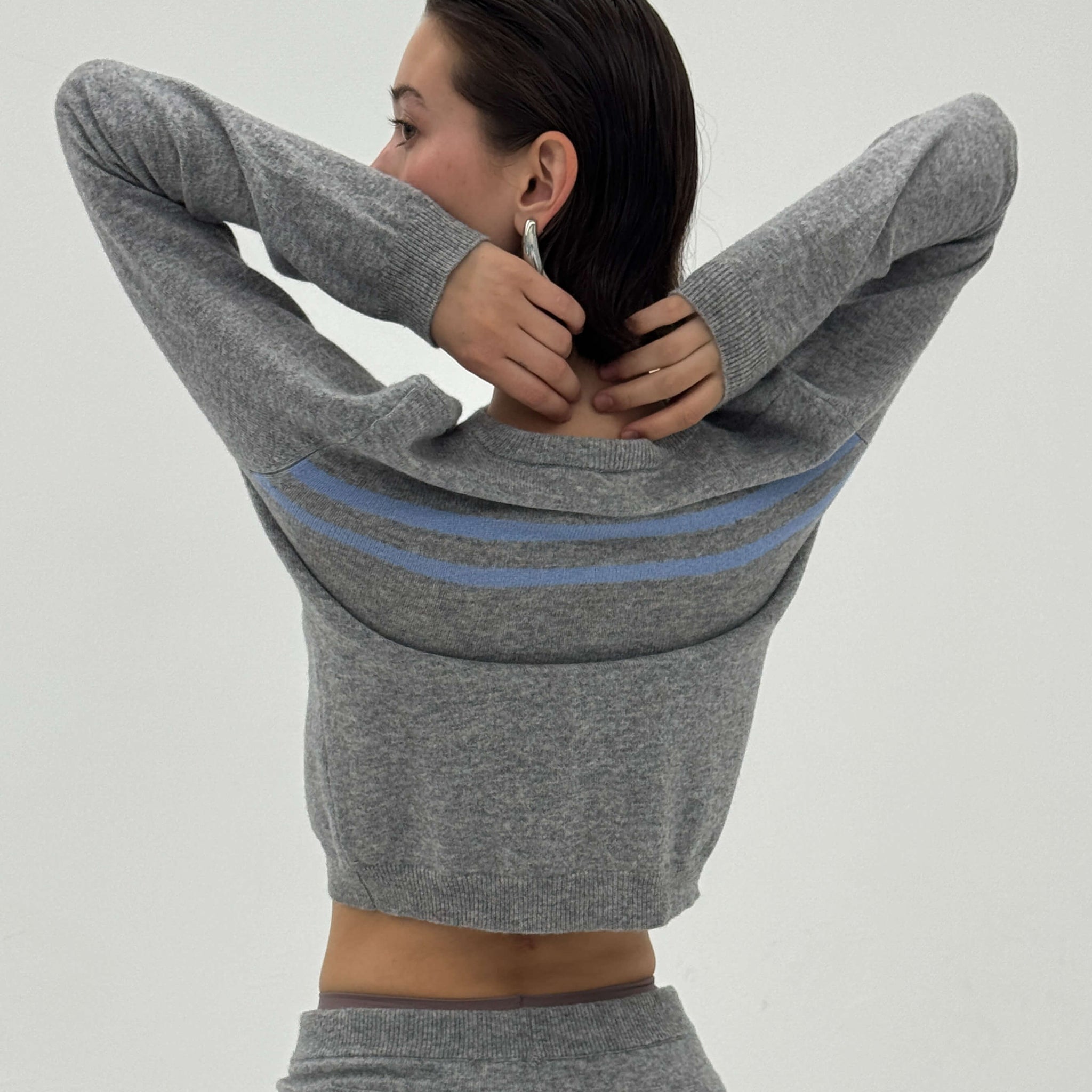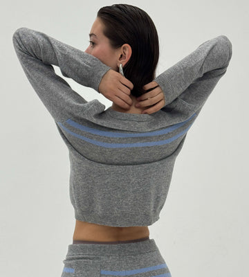 The Cashmere Wool Stripe Cardigan in Heather Grey/Cotton Blue is made from a lightweight cashmere-wool...
