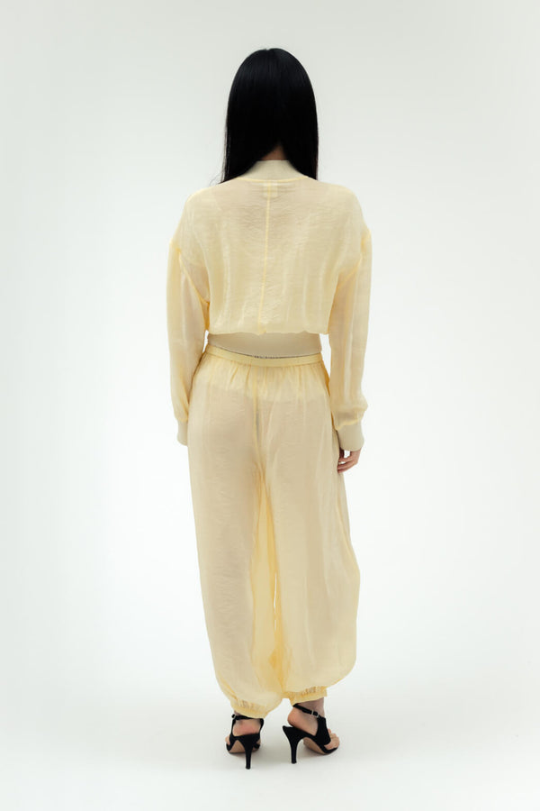 The Fabio Voile Jacket is a cropped style with chest pockets and elastic waistband. Pairs perfectly with the matching pants or your favorite jeans.