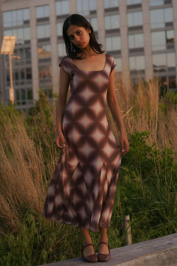 The Bitna Mesh Midi Dress in Clay offers a chic, contemporary design with an elegant mesh fabric.