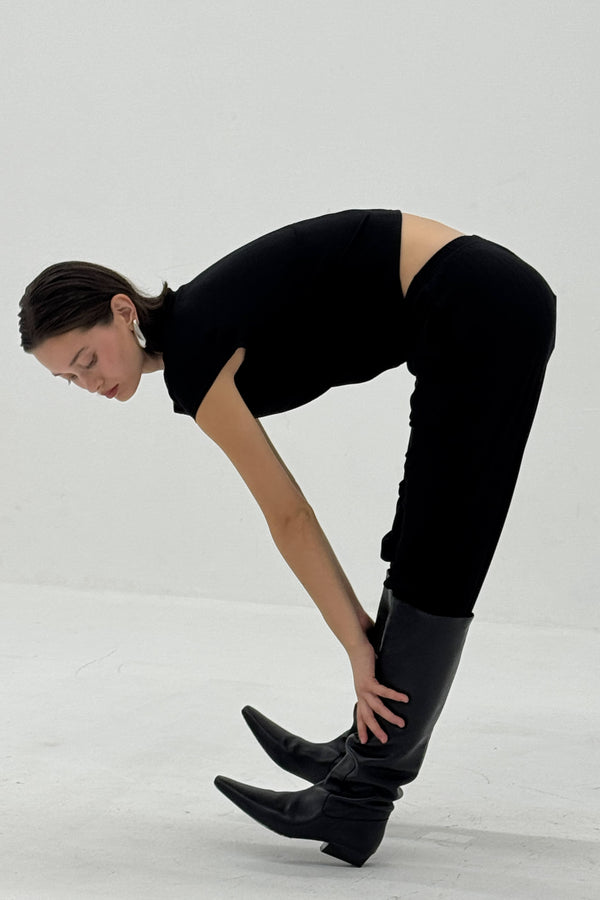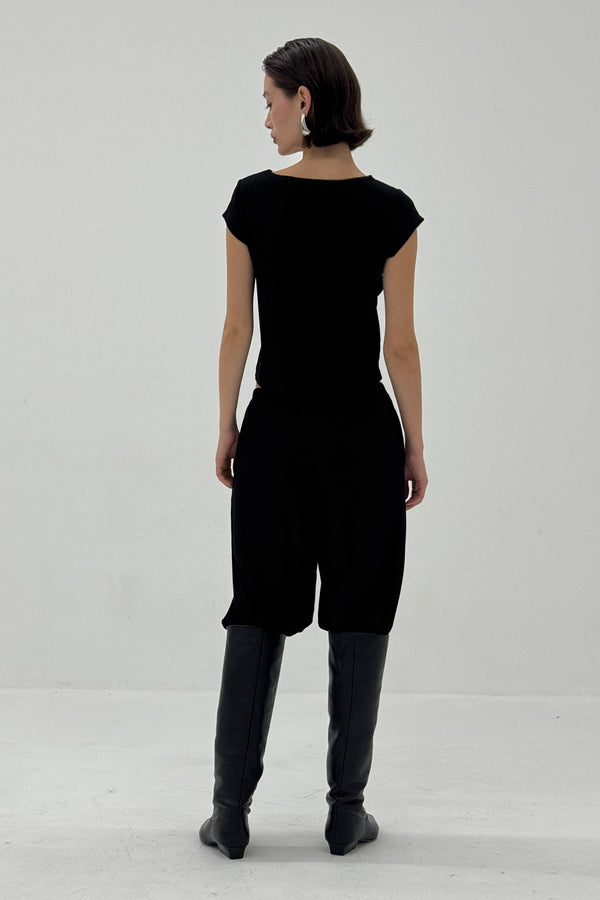 The Boat Neck Short Sleeve Top in Black is made from a smooth, stretchy ribbed jersey with a lightweight feel. Fitted through the body. Comfortable, breathable, and easy to wear every day.