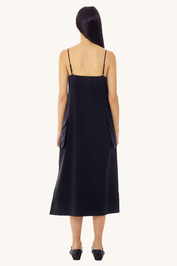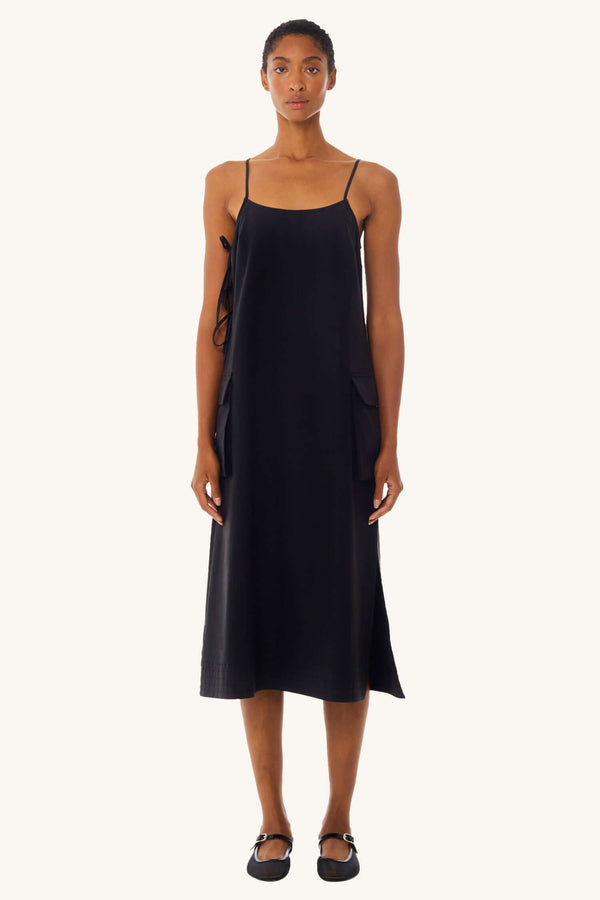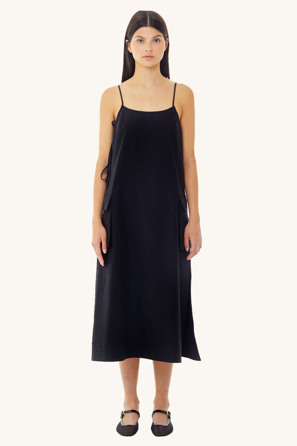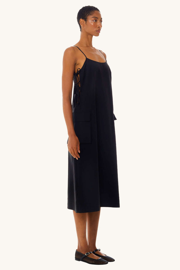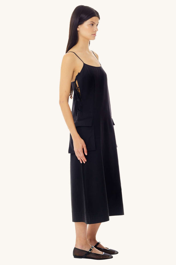 Utilitarian edge meets effortless cool in the Cargo Tie Midi Dress in Black. Designed with a relaxed silhouette and subtle structure, this dress features adjustable side ties that allow for a customizable fit and shape. Functional pocket details and a soft yet durable fabric add a utility-inspired vibe, while the midi length keeps it polished and wearable.