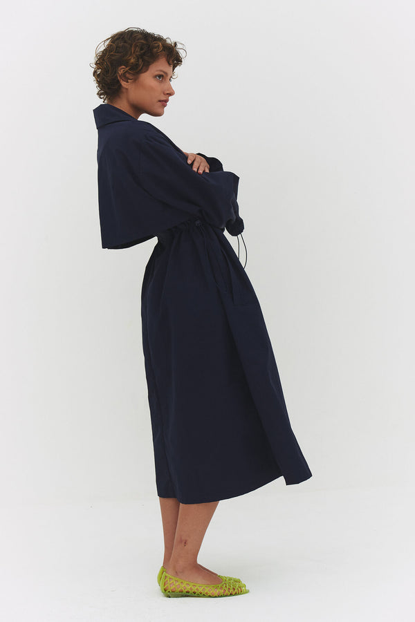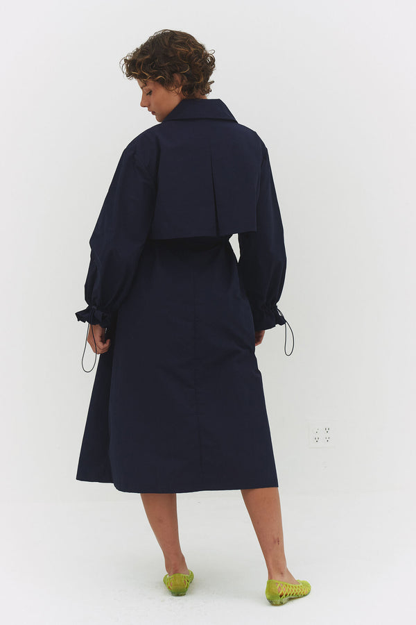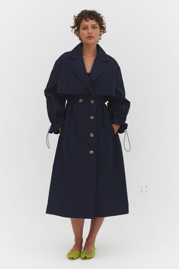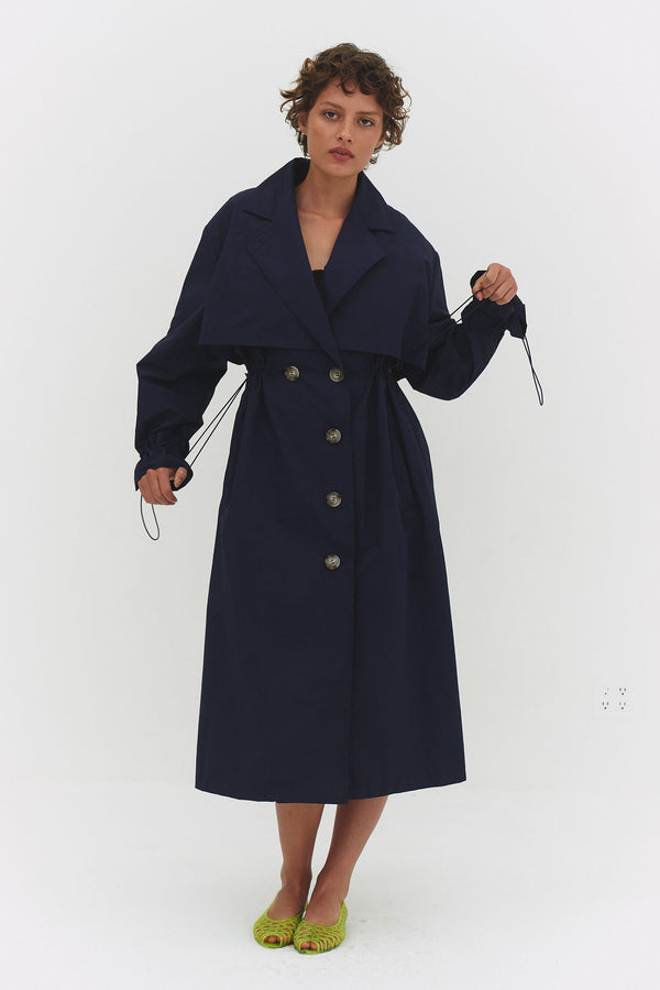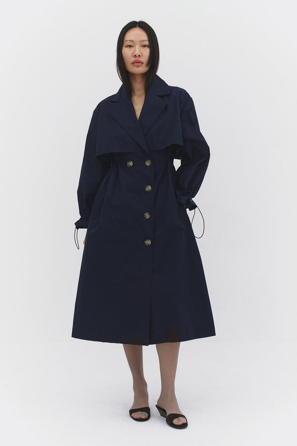 Classic move. The Danbi Trench Coat is a midi length trench with adjustable cuff ties, a cape back detail, and button closure. Timeless with a twist.