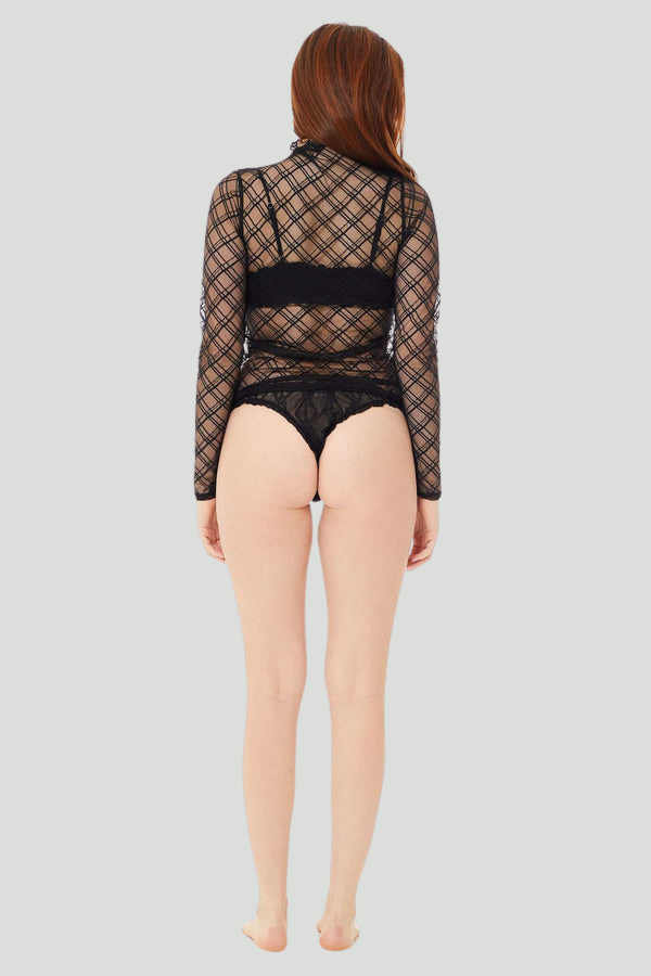 Featuring sheer mesh fabric and a sleek mock neck, this top adds modern sophistication to your wardrobe. Its obsidian-black hue makes it perfect for layering or as a statement piece.