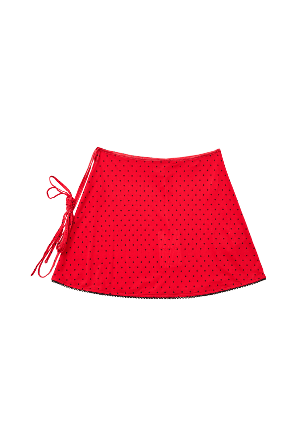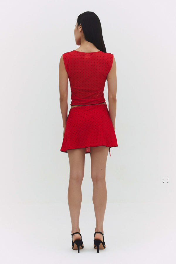 Tie it up. The Yara Skirt is a wrap mini skirt in polka dot mesh with adjustable side ties. Wear it as a set or mix and match.