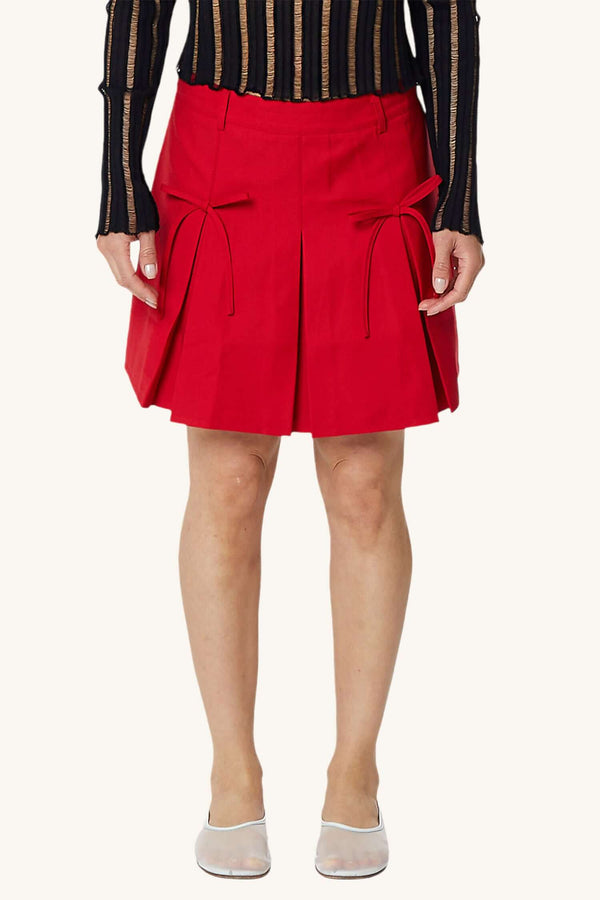 The skirt features a mid-rise and flattering front pleats. Dainty bows adorn the top of the pleats.