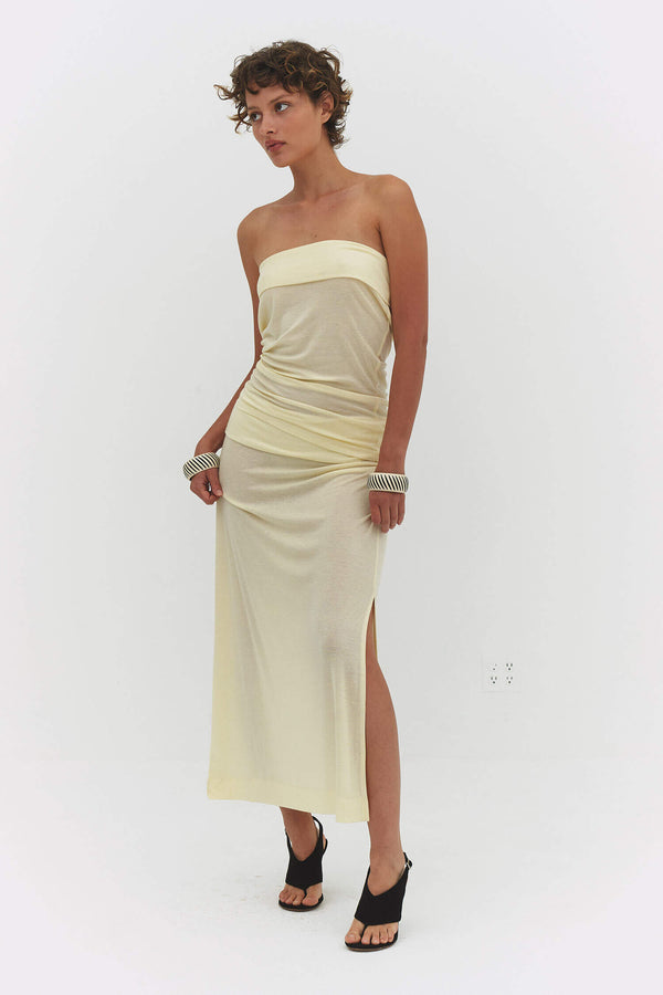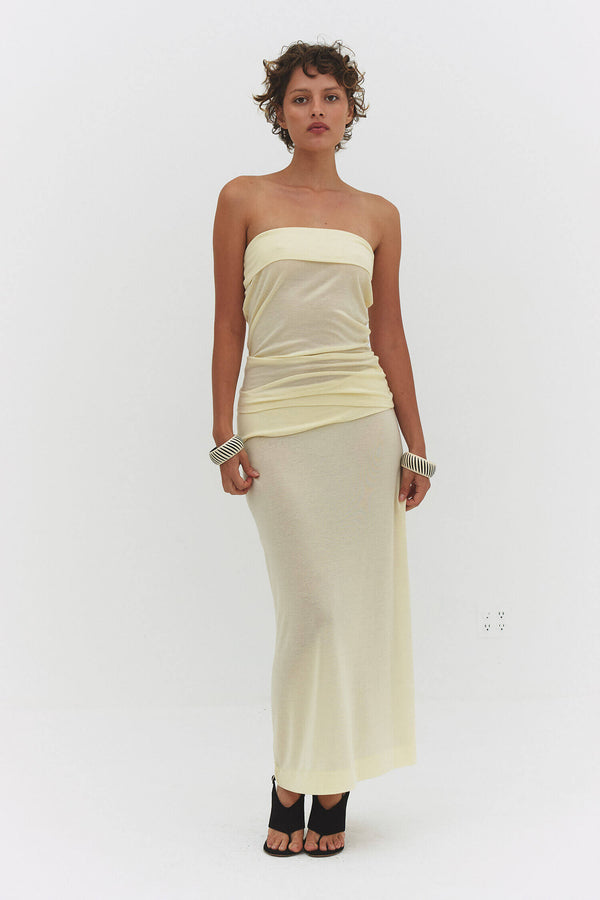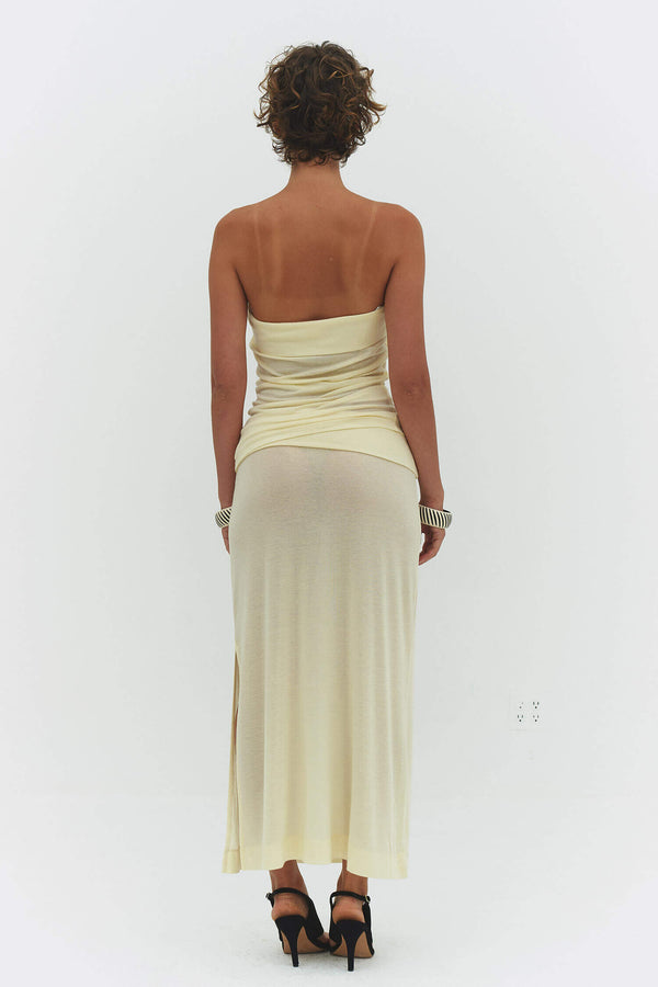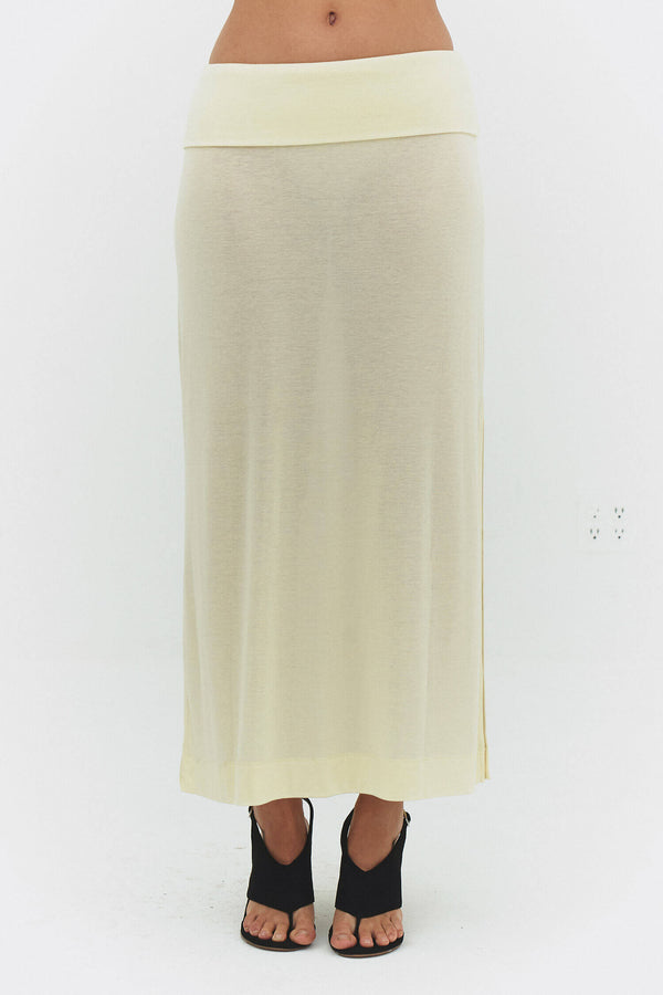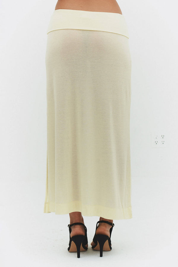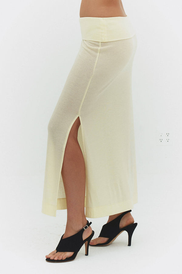 The Sori Skirt is a maxi length skirt with foldover waist and side slit detail. Style with the matching top for the full look.