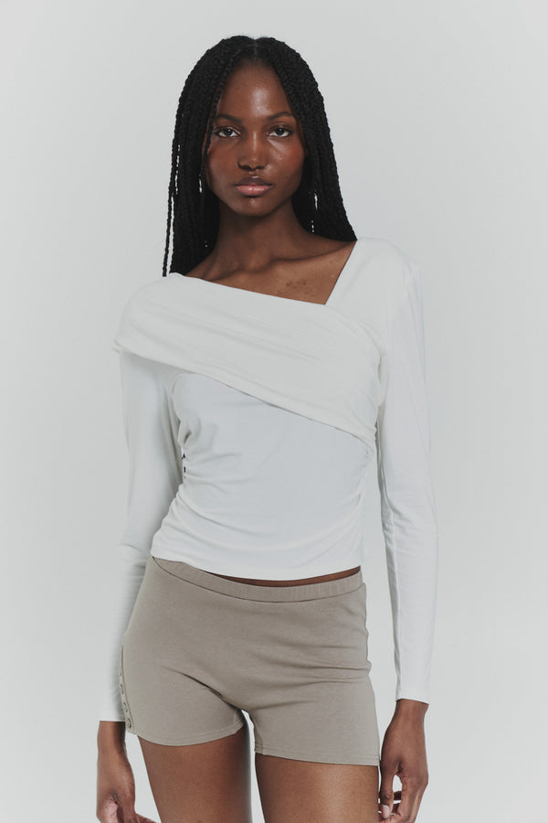 The half open shoulder top is an elevated top with an asymmetrical foldover at the neckline. Made out of tencel jersey, this top is stretchy, soft, and anti-pilling.