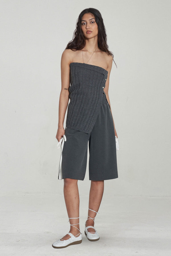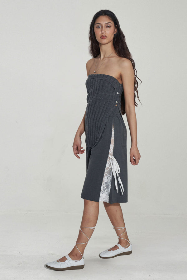 The Leisu Long Shorts in Cemet Grey feature a comfortable wide elastic waistband and soft knit fabric. The standout design element is the elegant side slit with delicate white lace insert and adjustable bow tie detail, creating a feminine contrast against the structured texture.