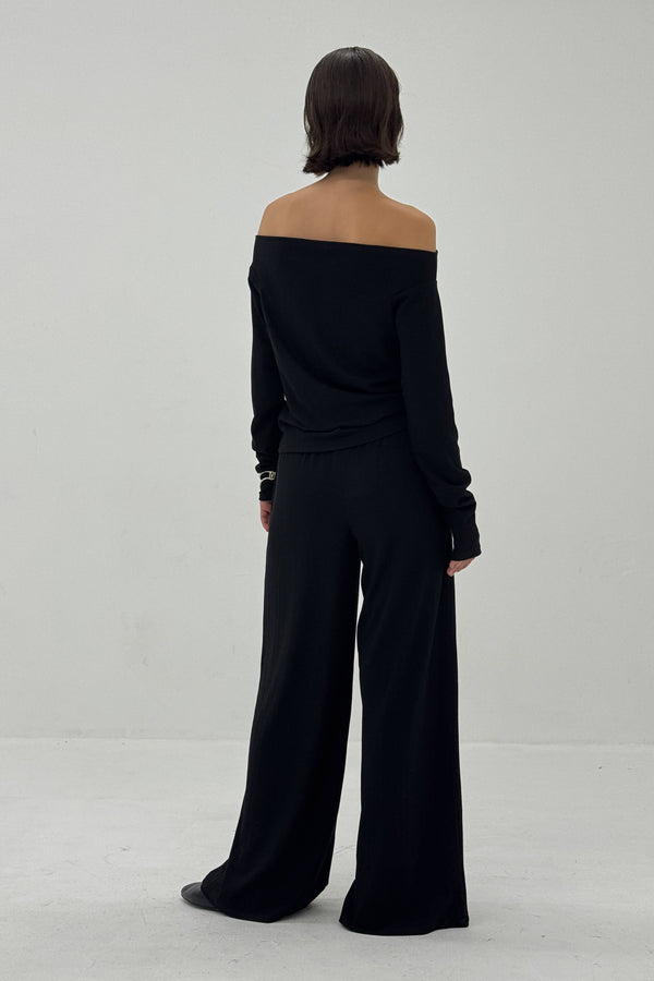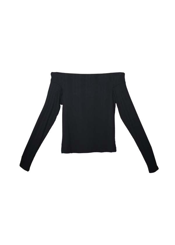 The Long Sleeve Open Shoulder Top in Black is made from a rayon-blend polyester rib lounge jersey with extra comfort and softness. Fitted and stretchy with a flattering off the shoulder detail. Cozy, breathable, and perfect for lounging or layering. Pair with the Button Lounge Pants in Charcoal for the ultimate lounge set.
