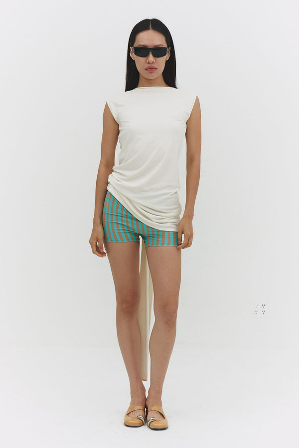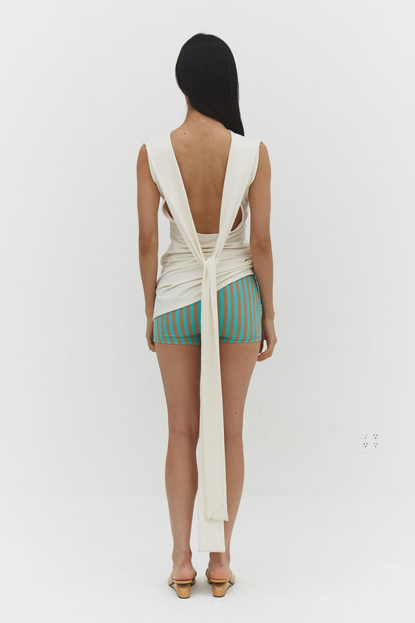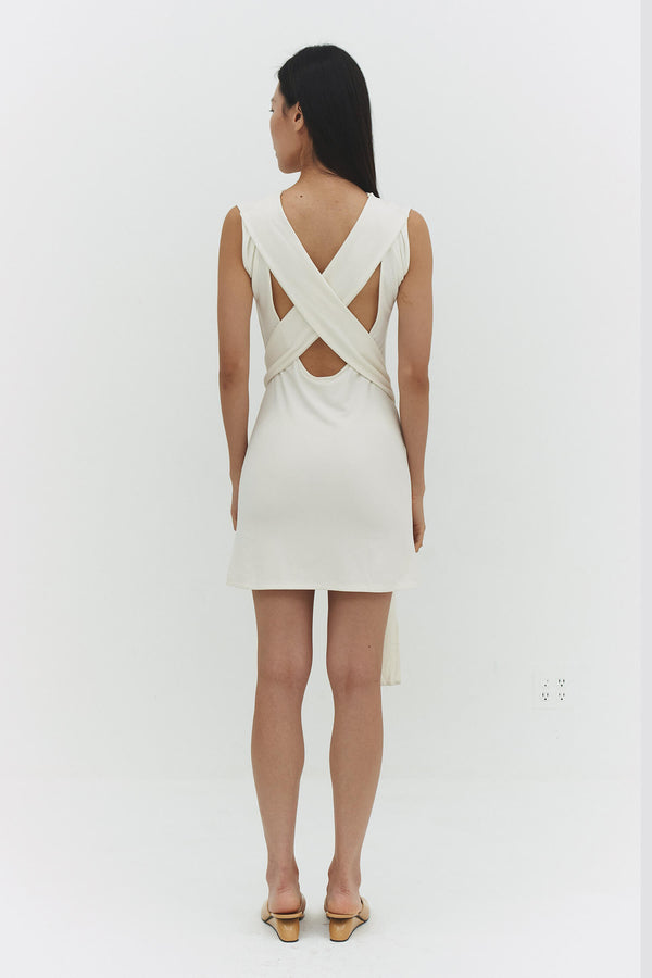 Back at it. The Beatriz Dress is a mini dress with crisscross open back, side tie detail, and boat neckline. Effortlessly elevated.
