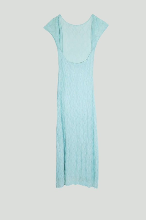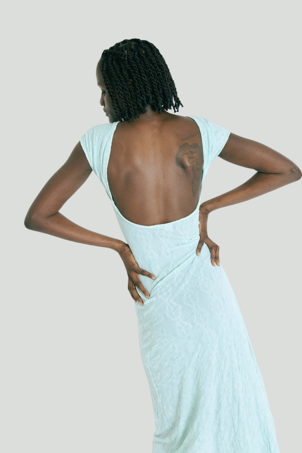 With its flowing silhouette, subtle mint hue, and daring backless design, this dress is perfect for garden parties, weddings, or formal evenings.