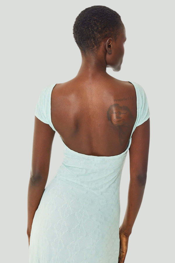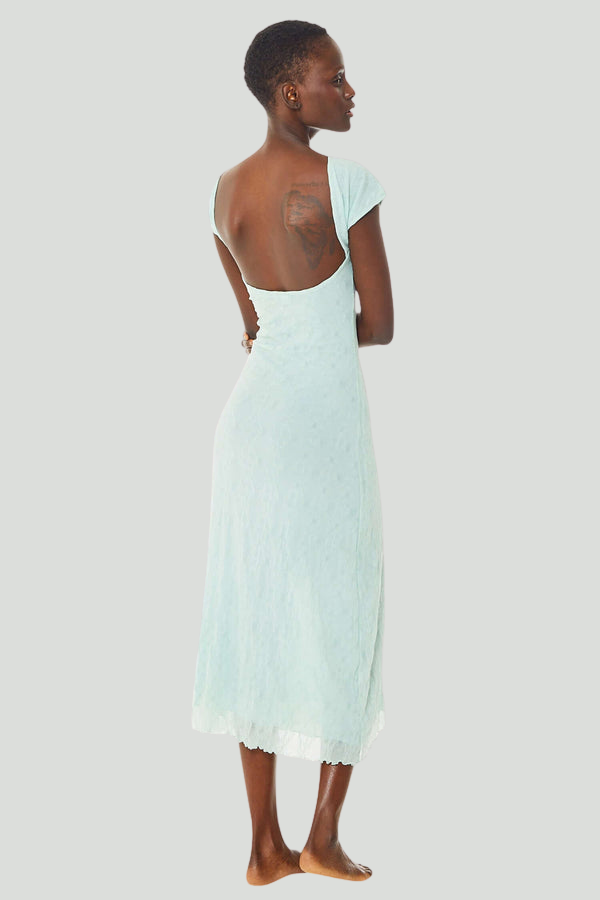 The Mariposa Backless Midi Dress in Mint is a vision of elegance.