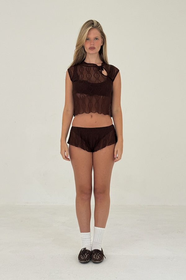 The Mariposa Keyhole Tee in rich Brown combines understated luxury with feminine detail.