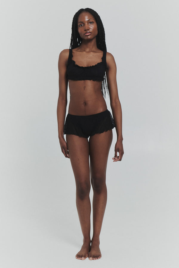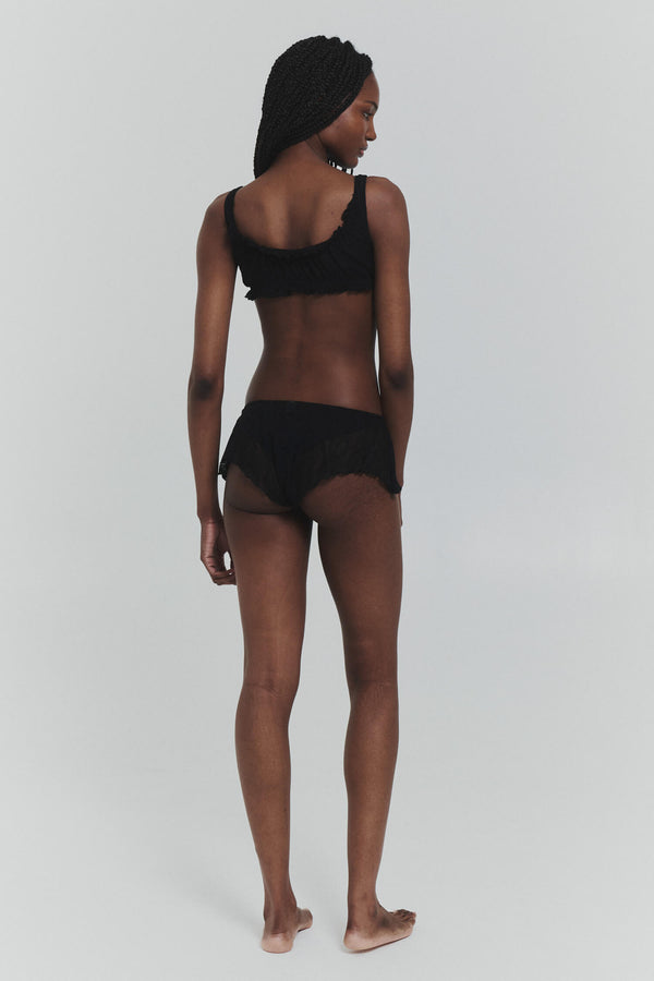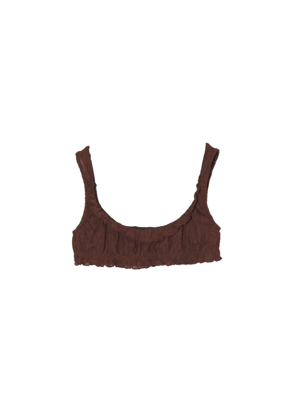 chocolate bralette with delicate ruffle detail. soft mariposa fabric designed for everyday comfort that moves with you. wear alone or layer under sheer pieces.