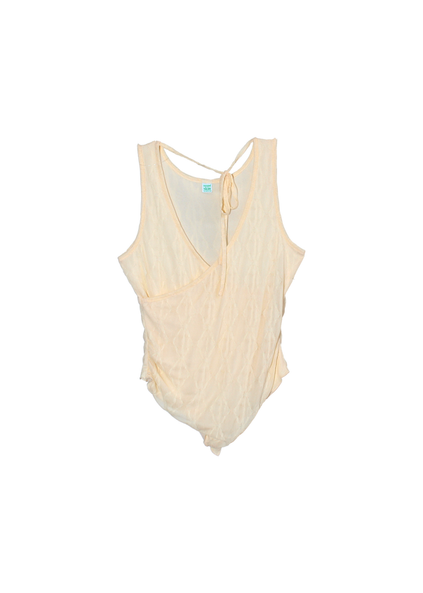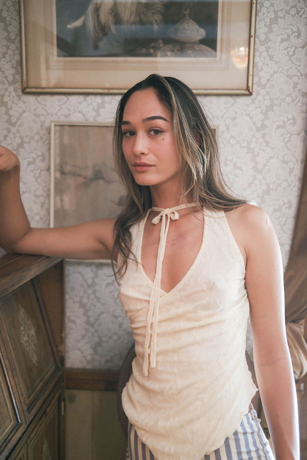 sleeveless illusion wrap top in cloud with adjustable tie at front or back neck. soft mariposa fabric with slight stretch for comfort. designed to adjust to your shape.