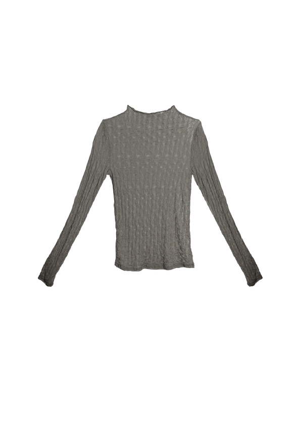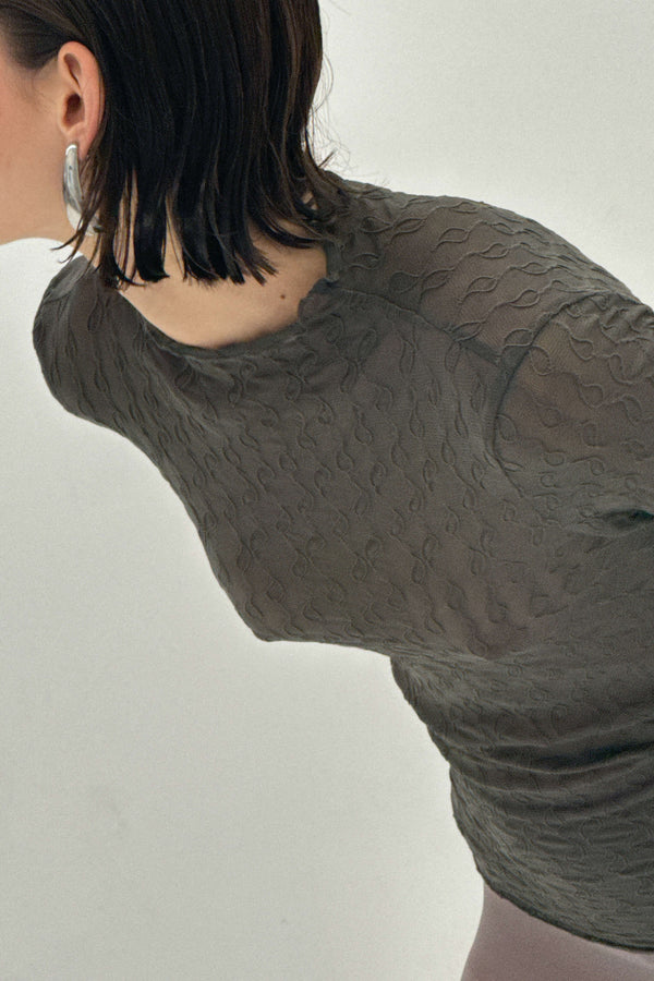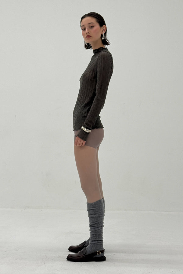 The Mock Neck Long Sleeve Top in Olive Green is made from soft, stretchy lace with a close, comfortable fit. Features a high neckline and subtle transparency. Lightweight and breathable for layering or wearing on its own.