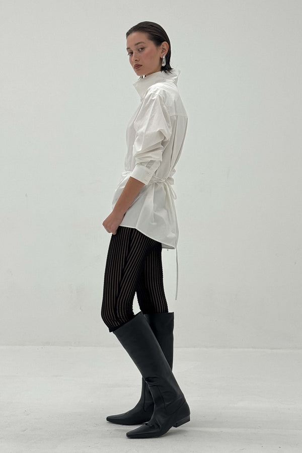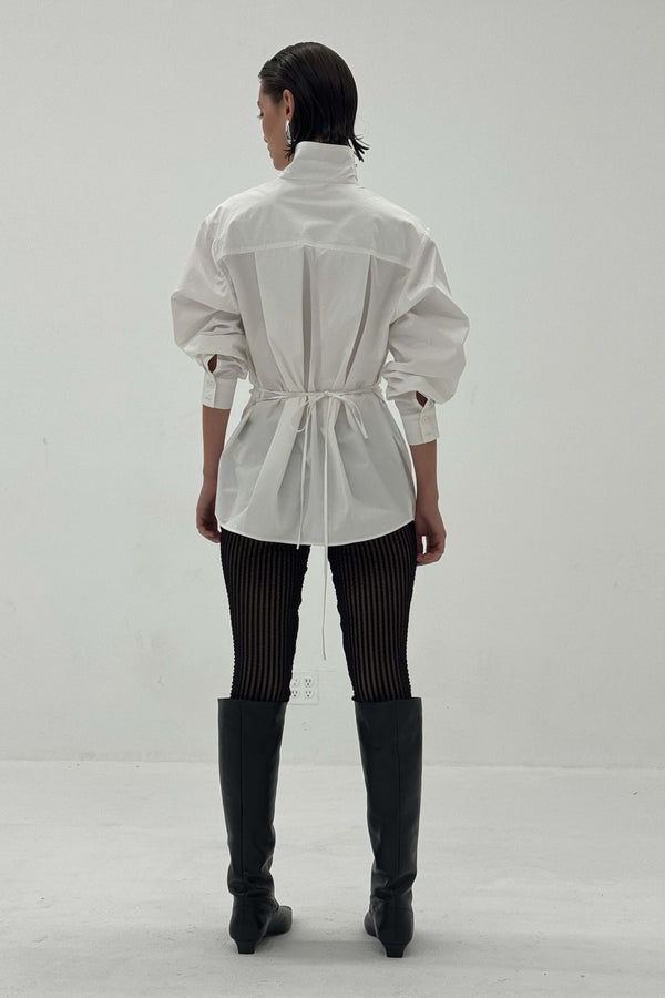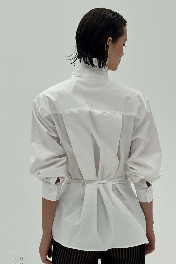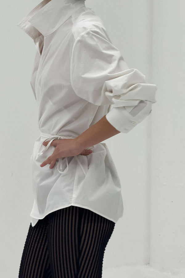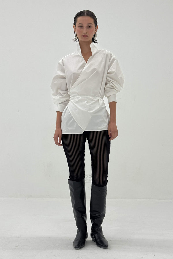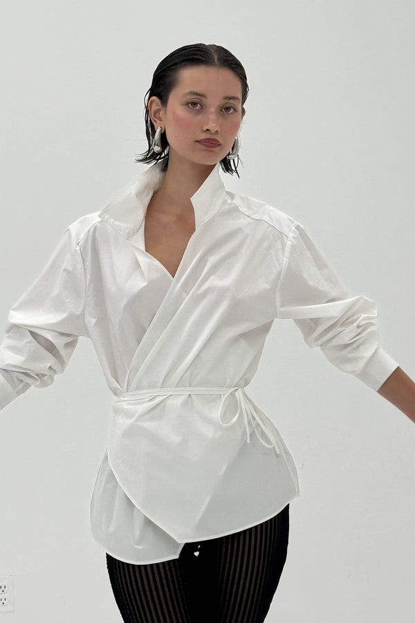 The Mukkda Blouse in White is made from smooth cotton shirting with just the right amount of structure. Wrapped and pleated through the front, it creates a cinched silhouette with crisp edges and a bit of drama. Light, breathable, and not your average button-up