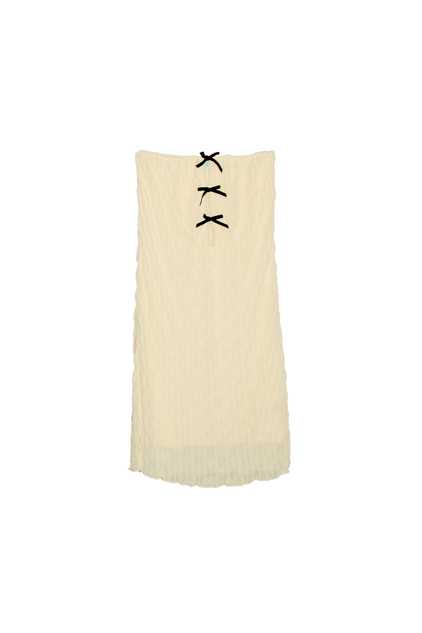 The Ross Bow Strapless Micro Mini Dress in White radiates contemporary elegance with playful sophistication.