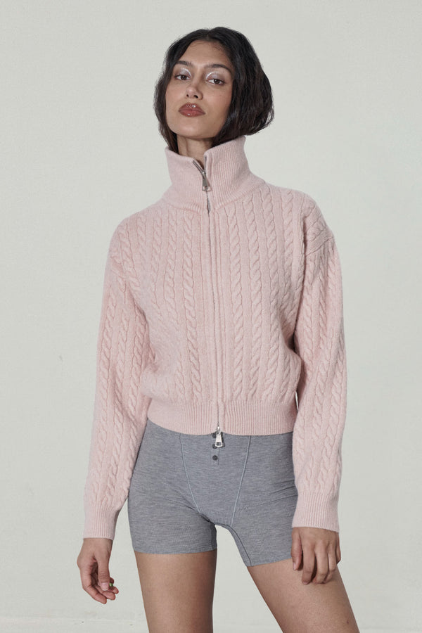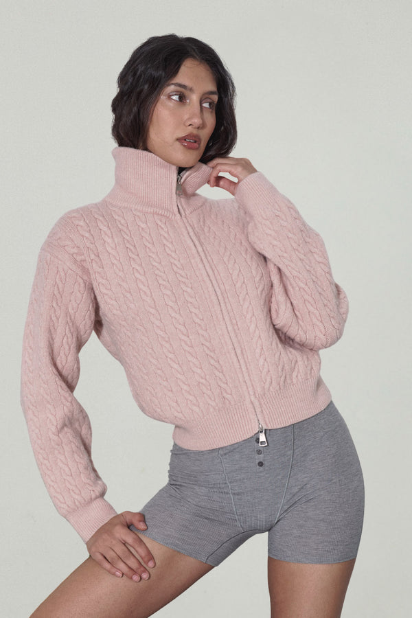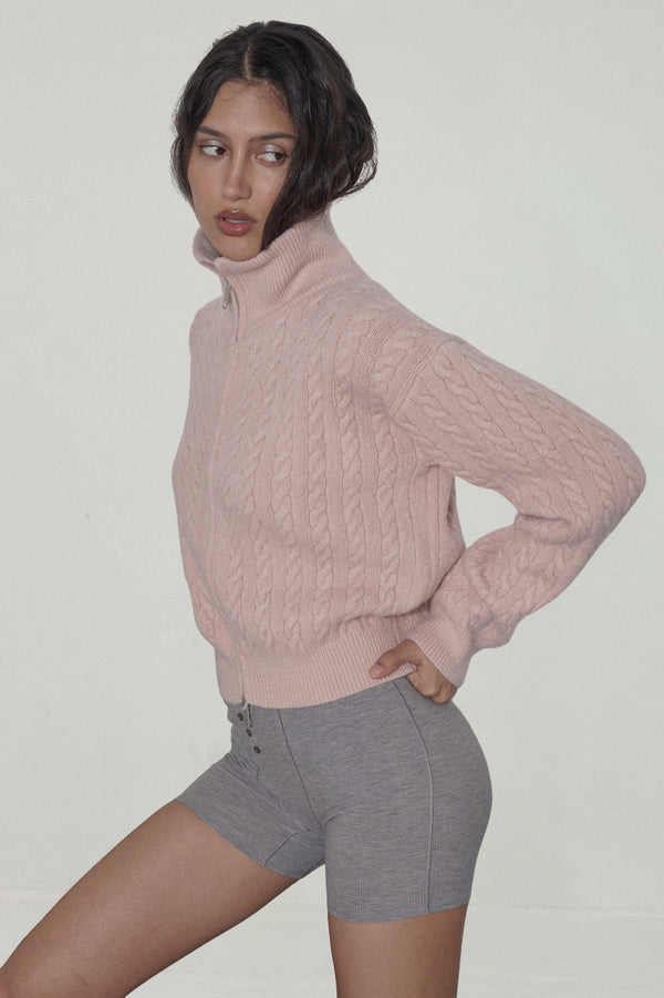 The Two-Way Zipper Cardigan in Dusty Pink is made from a soft, stretchy knit blend with a comfortable fit. Fitted and versatile with a two-way zipper for customizable styling. Cozy, chic, and easy to layer.