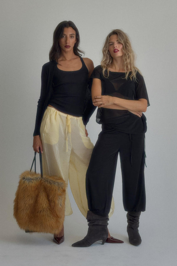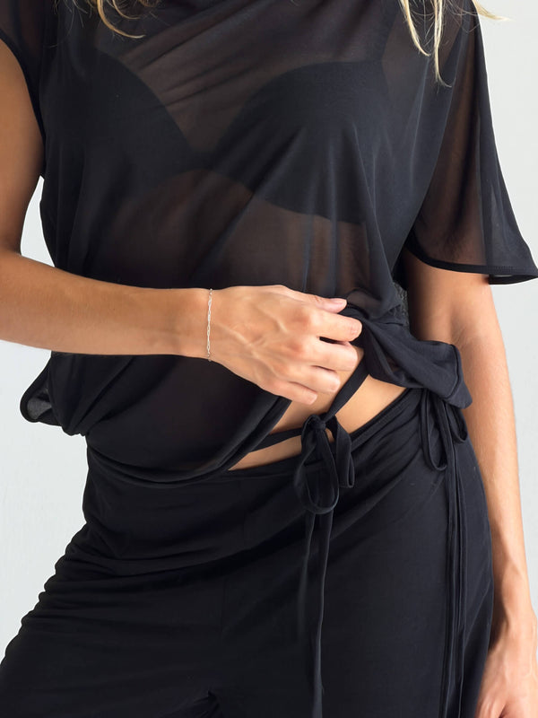 The Wide Leg Tie Pants in Black are made from extra lightweight stretch voile with organza-like sheerness and a cooling effect. Relaxed and elegant with a wide-leg silhouette and adjustable side tie waist detail. An effortless piece in classic black, featuring soft, fluid drape and a dry handfeel. Pairs perfectly with the matching One Shoulder Tie Top for a complete look.
