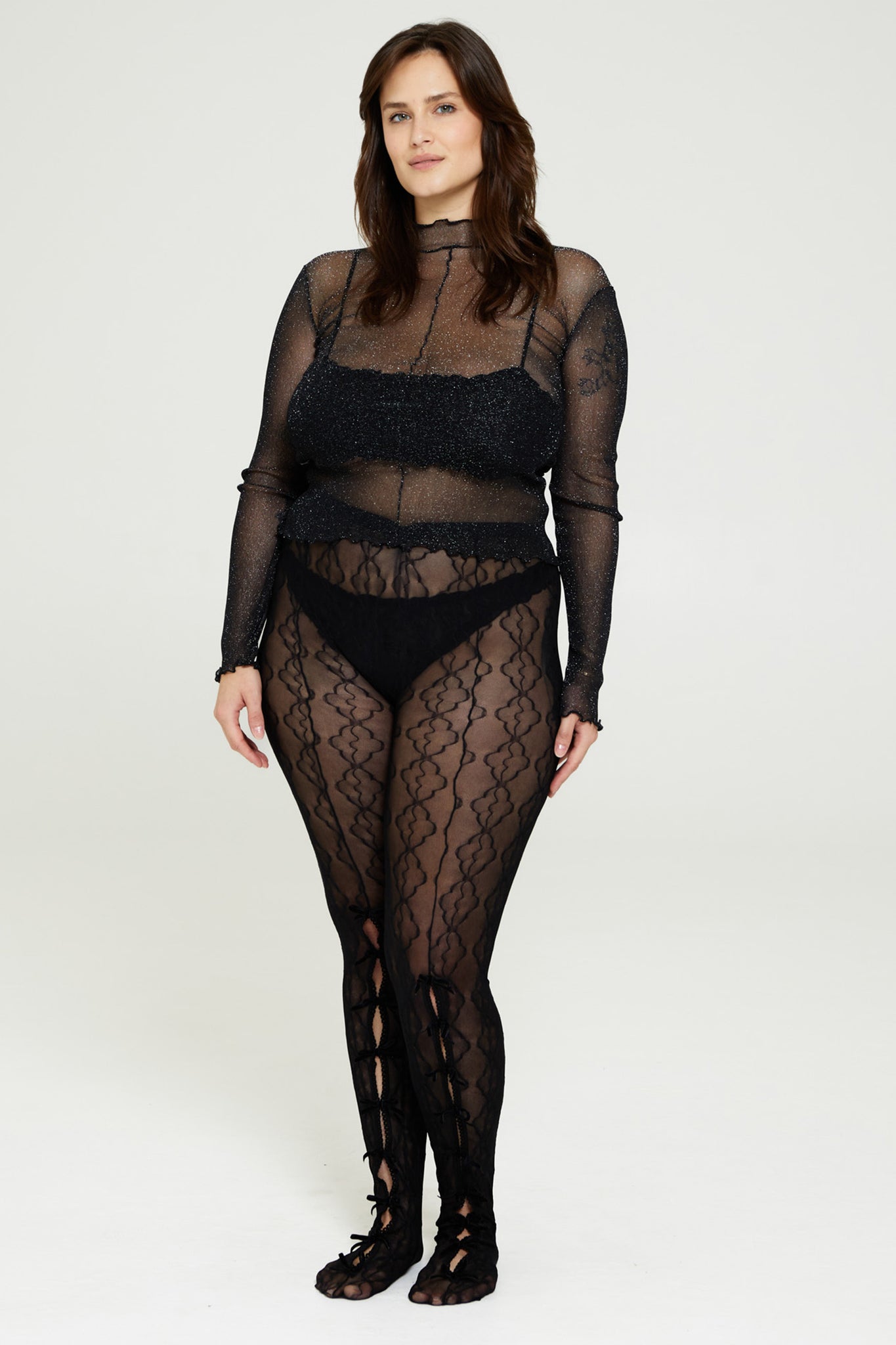 Our best-selling Mariposa lace now in the loveliest pair of tights. These lace tights feature precious bows over cutouts starting at the knee.